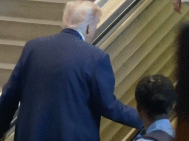 एस्केलेटर खराब होने के कारण ट्रम्प को सीढ़ियों से चढ़कर UN हॉल तक पहुँचना पड़ा। -